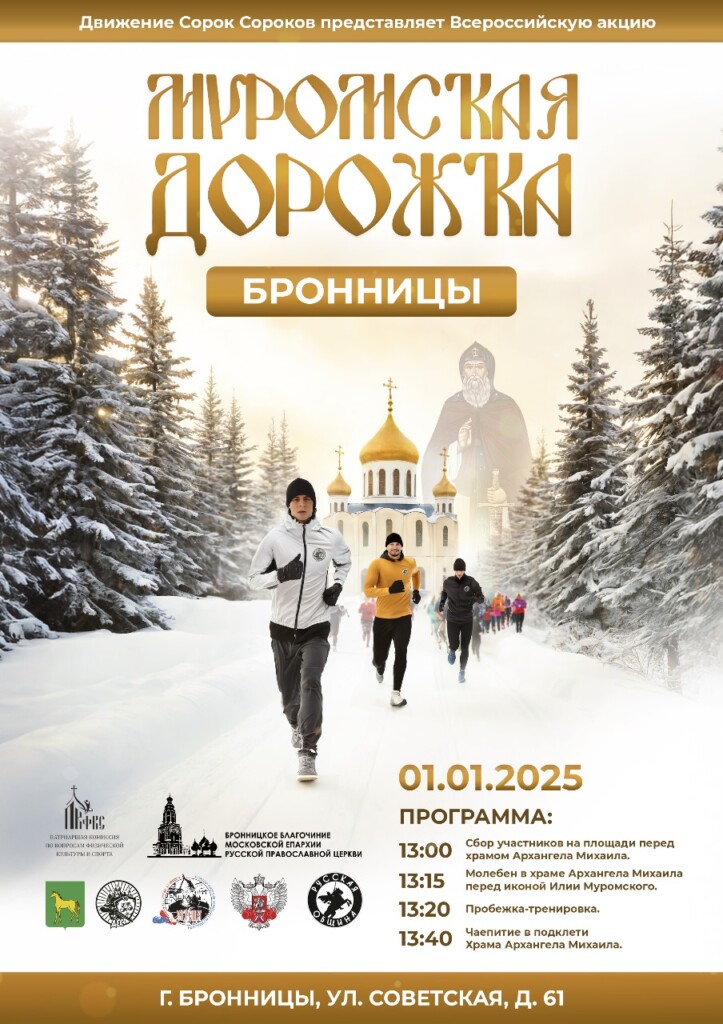 Движение Сорок Сороков при поддержки 1-го Бронницкого благочиния представляет Всероссийскую акцию «Муромская дорожка. Бронницы», которая состоится 1 января 2025 года в 13:00. Место встречи — площадь перед собором Архангела Михаила г. Бронницы.