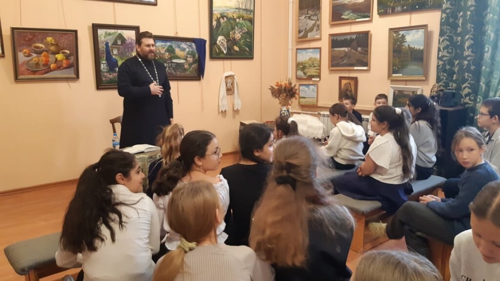 18 декабря ответственный по образованию в 1-м Бронницком благочинии, настоятель Никитского храма с. Софьино иерей Александр Ионов в помещении школьного музея Софьинской средней общеобразовательной школы Раменского г.о. провёл беседу о евангельских притчах с учащимися 5 классов. Встреча была организована учителем русского языка и литературы Александрой Алексеевной Тихоновой и учителем музыки Ириной Александровной Пархомчук.