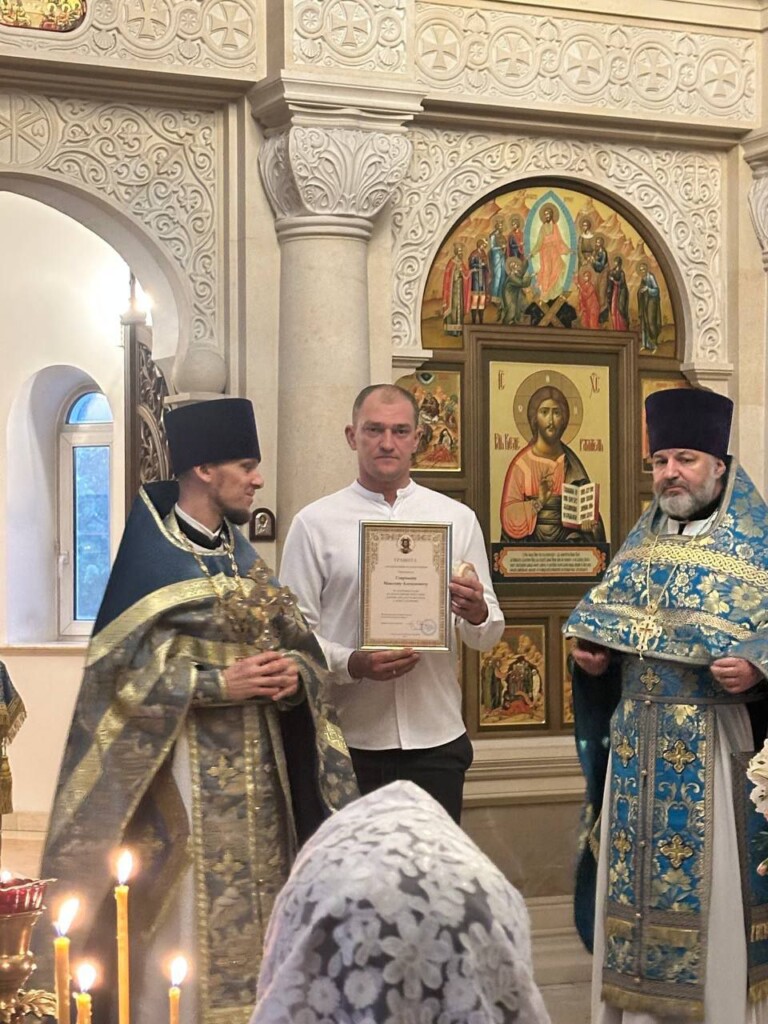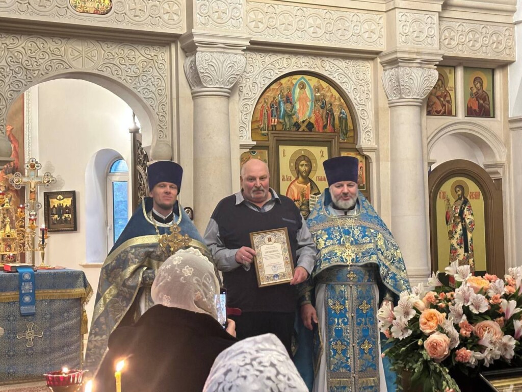 По завершении Литургии отец Сергий вручил грамоту митрополита Крутицкого и Коломенского Павла помощнику настоятеля Александру Викторовичу Бутыльскому, а также грамоту благочинного 1-го Бронницкого округа прихожанину храма Максиму Алексеевичу Старикову, который особо отличился своими трудами на приходе.