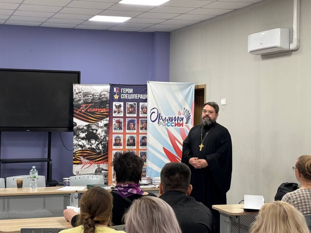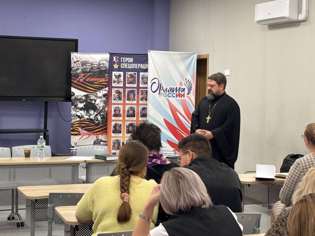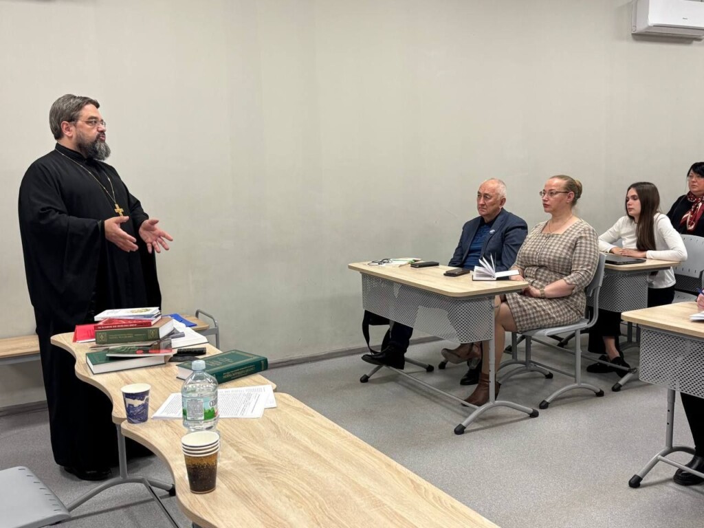 Отец Димитрий рассказал собравшимся о жизненном пути и просветительской деятельности святителя Тихона, мероприятиях, приуроченных к 100-летию преставления иерарха, презентовал основную литературу и электронные ресурсы, которые могли бы быть использованы педагогами по данной теме.