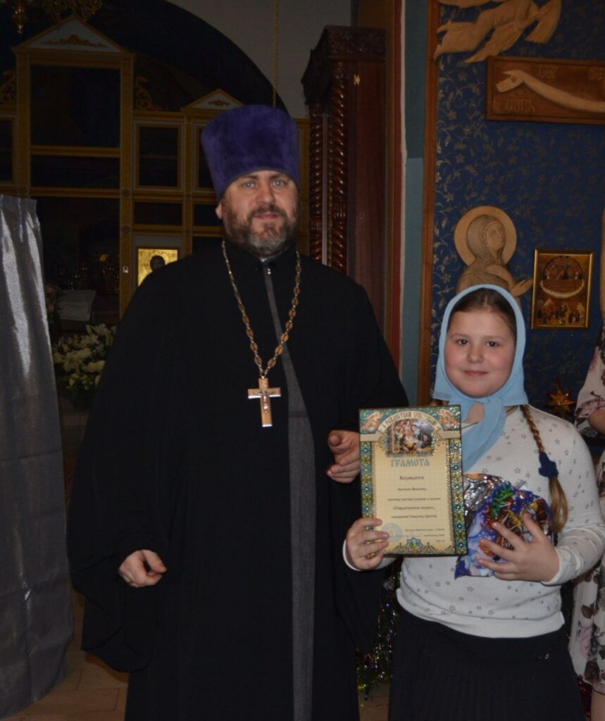 Настоятель храма иерей Александр Ионов поздравил всех с праздником Рождества, поблагодарил ребят за труды и вручил участникам тематической выставки «Рождественская сказка» памятные подарки и грамоты.