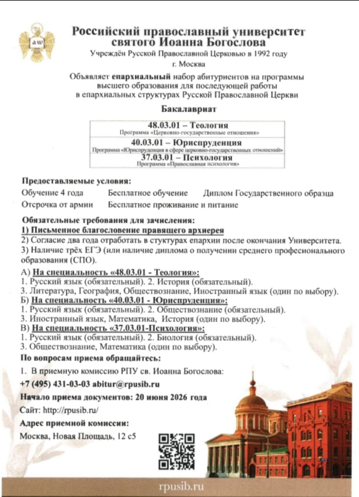 ВАЖНОЕ ОБЪЯВЛЕНИЕ: Епархиальный набор абитуриентов на программы высшего образования в Российском православном университете св. Иоанна Богослова